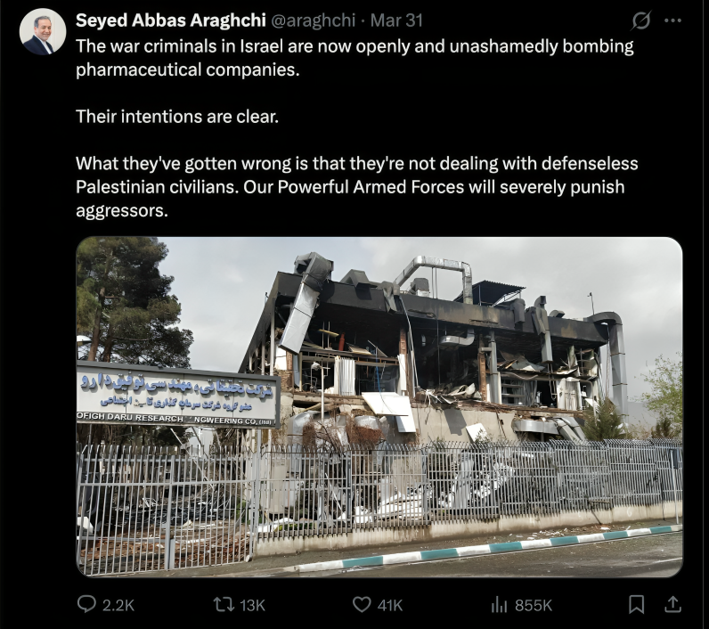 “The war criminals in Israel are now openly and unashamedly bombing pharmaceutical companies,” Araghchi posted, accompanied by images of the destruction. “What they’ve gotten wrong is that they’re not dealing with defenseless Palestinian civilians. Our Powerful Armed Forces will severely punish aggressors.”